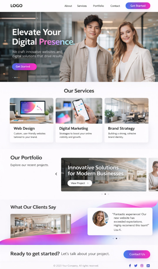 Till att börja med arbetar bluetronix vanligtvis med en layout som utgångspunkt. Du får tillgång för att kunna titta på olika layouter i webbplatsbyggaren och välja en favorit. Denna layout anpassar bluetronix sedan till ditt varumärke, till exempel med färger, typsnitt och andra designdetaljer. Steg för steg skapas en webbplats som estetiskt passar ditt företag och samtidigt bygger på en beprövad grund.